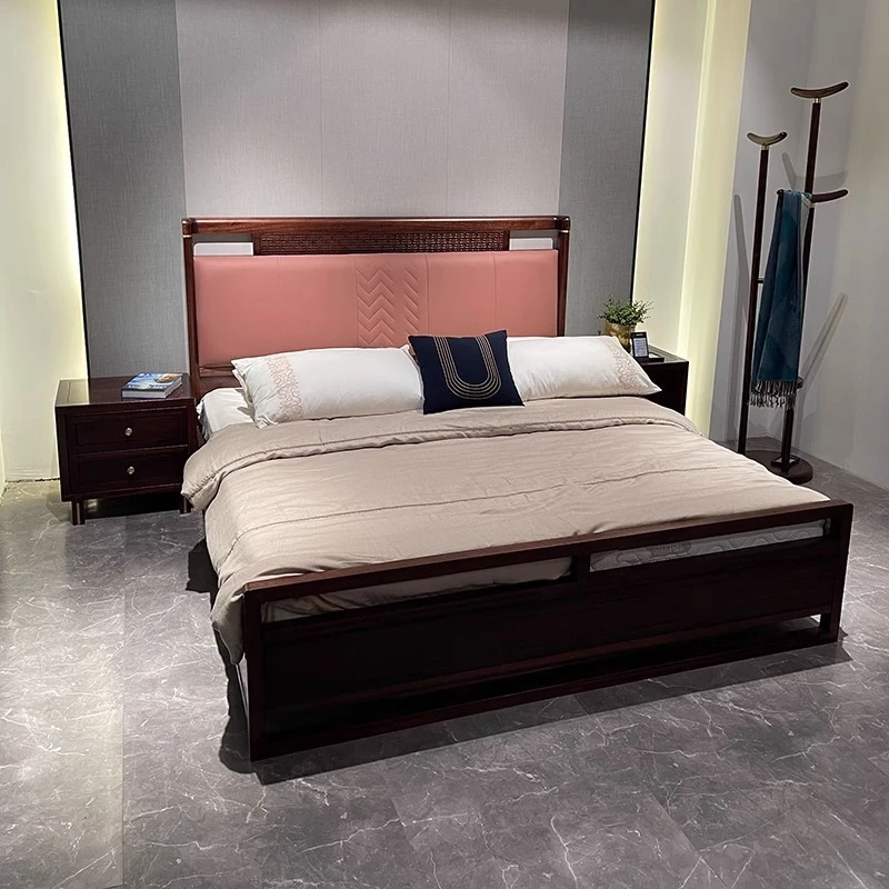 新中式軽奢ウッドベッド、ウーキン材使用のダブルベッド!贅沢な本革ソフトパッキング付き、1.8メートルのモダンな高級婚礼ベッド。あなたの主寝室にぴったりのスタイルと快適さを提供します。