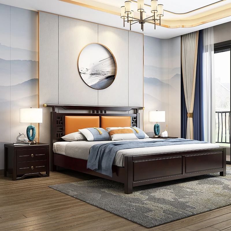 新中式高級実木ベッド - モダンなウッディブラックデザイン、上質なレザー使用のダブルベッド。魅力的な軽奢スタイルで、主寝室や別荘にぴったりな結婚用ベッド。あなたの生活空間を華やかに彩ります!