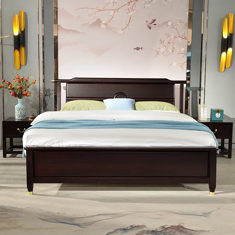 高級感あふれる新中式デザイン!無垢のブラックウォールナット製ダブルベッドフレーム、ホテルや民宿に最適な上質な寝室家具。快適な眠りを提供します。