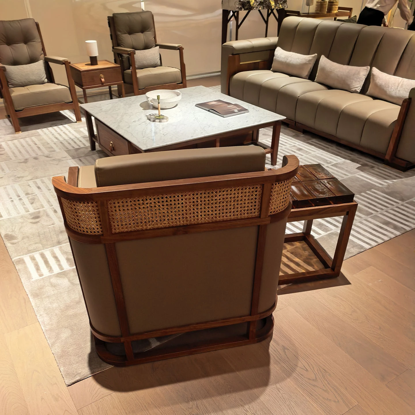 2025 New High-End Modern North American Black Walnut Leather Sofa - Stylish Solid Wood Furniture for Small Spaces in New Chinese Style