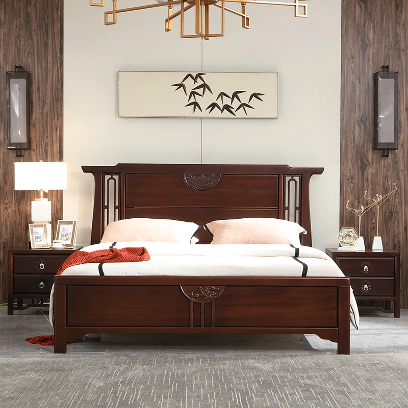 Elegant New Chinese Style Solid Wood Bed - French Vintage 1.8m King Size Black Walnut - Premium Hotel and Airbnb Furniture with Classic Aesthetic