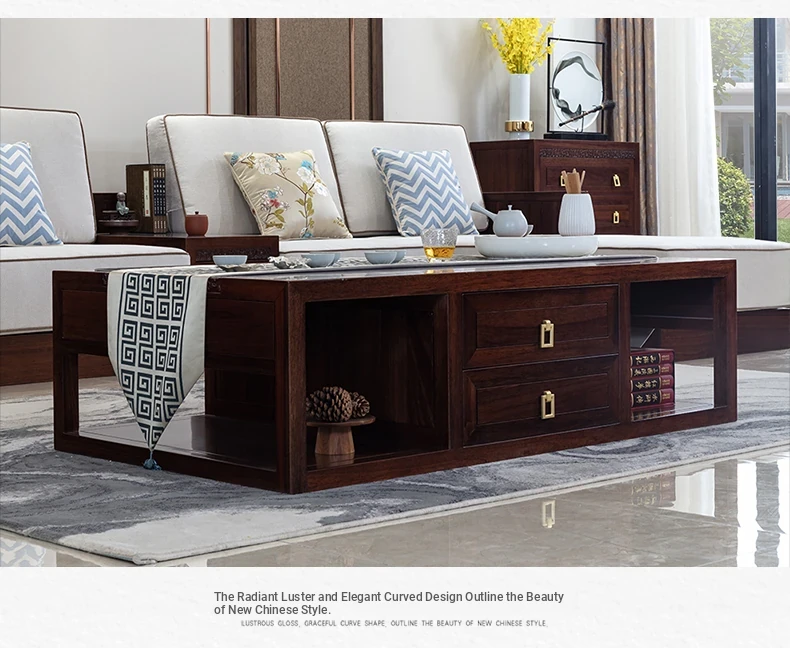 Elegant New Chinese Style Solid Wood Coffee Table with Ebony Carvings - Zen-Inspired Rectangular Two-Tier Tea Table with Drawers for Living Room, Perfect for Tea Ceremonies and Sofa Arrangement