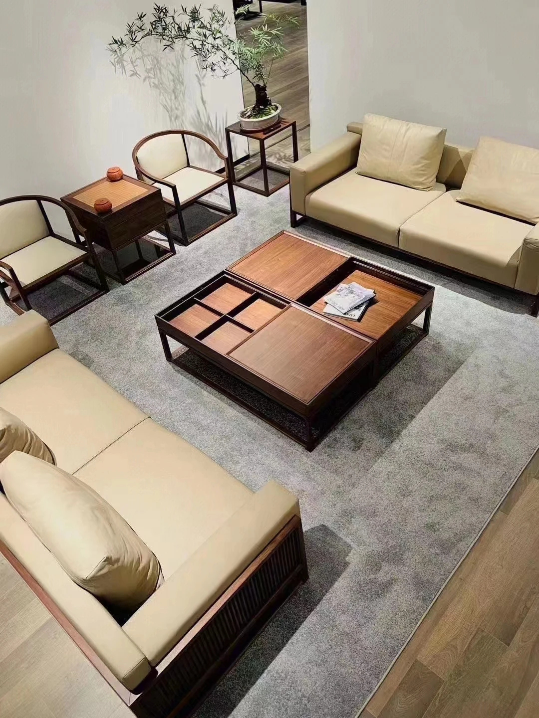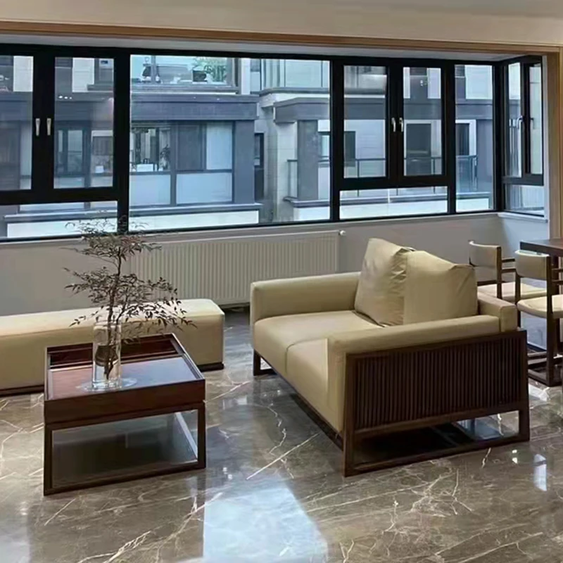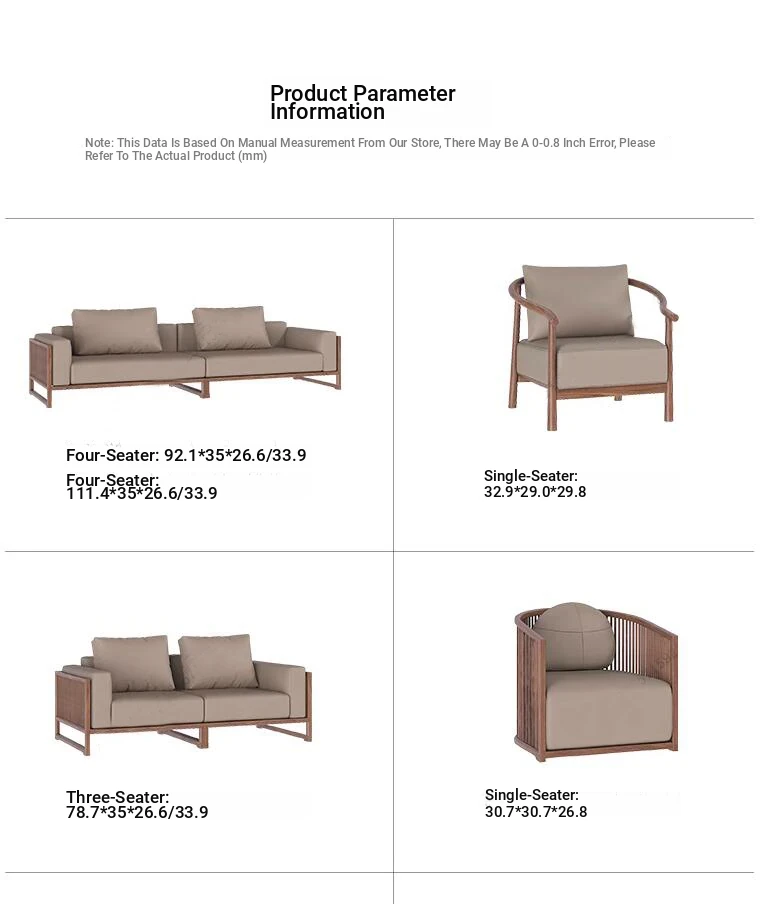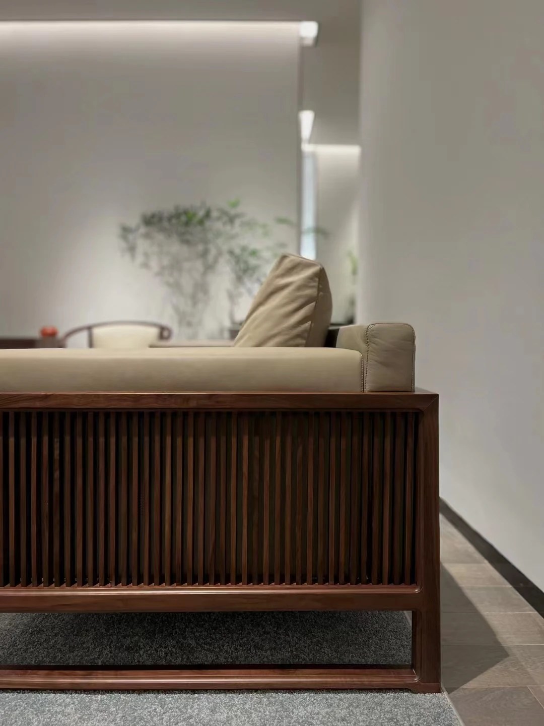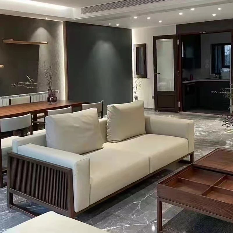 Modern Chinese Solid Wood Sofa Set for Small to Large Living Rooms – Minimalist Design in Black Walnut with Genuine Leather, Perfect for Homes and Hotels