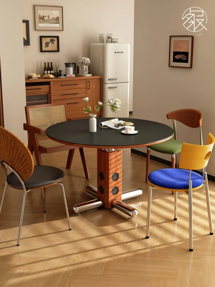 Charming Vintage Round Dining Table with Solid Ash Wood and Stainless Steel Legs - Unique Polka Dot Design for a Luxe Yet Affordable Touch to Your Home Decor.