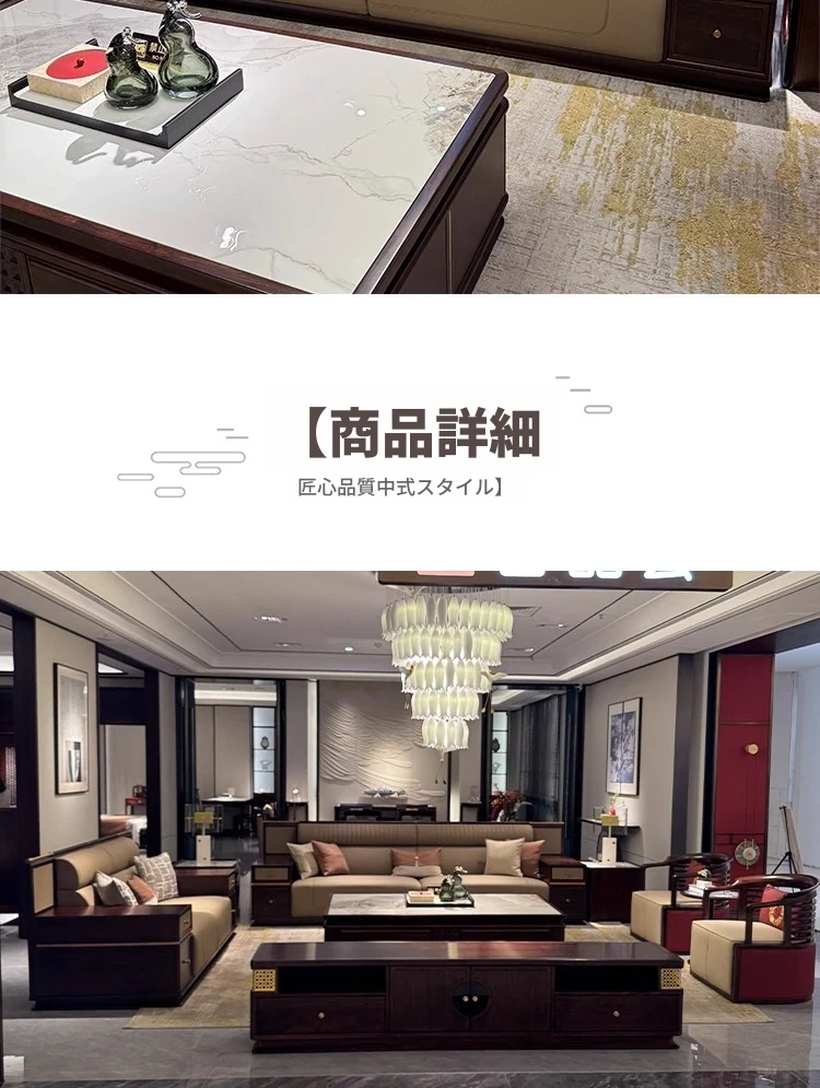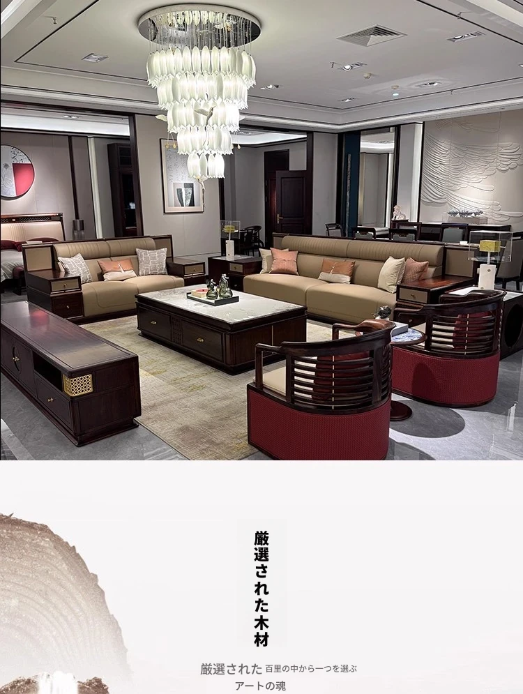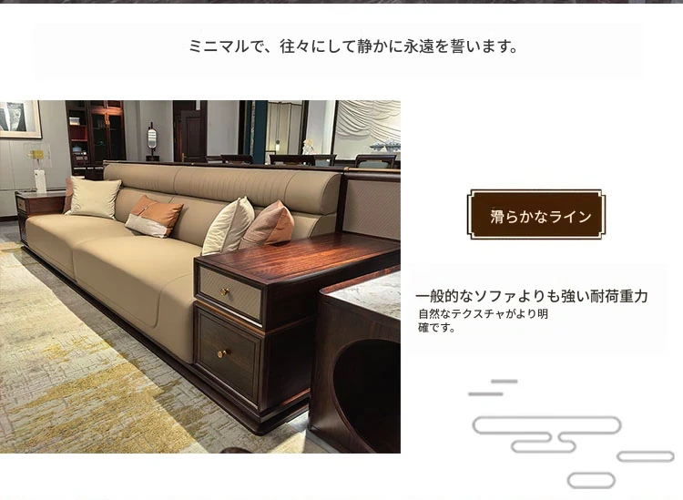 2025年新作!新中式デザインの高級感あふれるウッディソファ。小〜中型のリビングに最適な真皮製、直線的な美しさを持つウーキン材使用。あなたのリビングを格上げする一品!