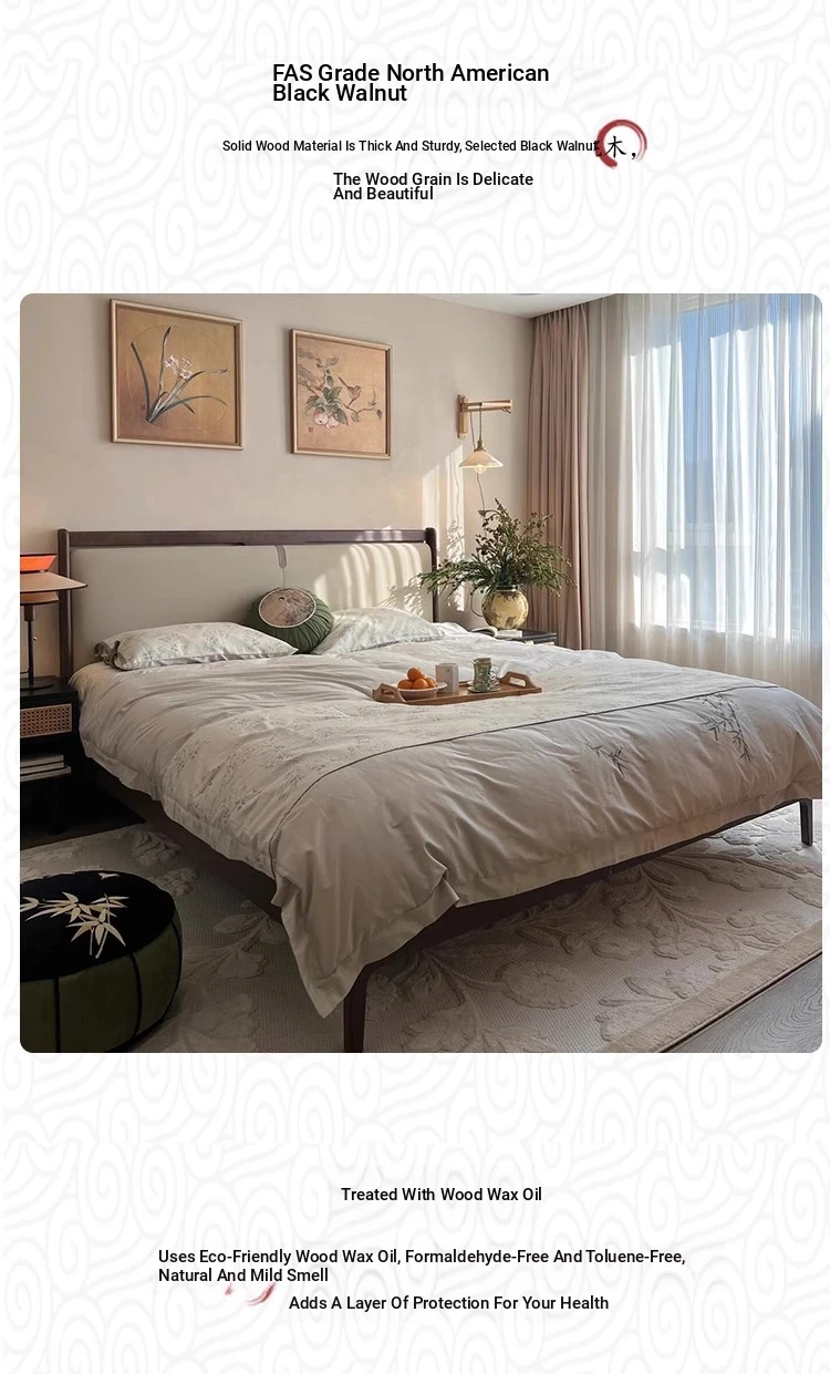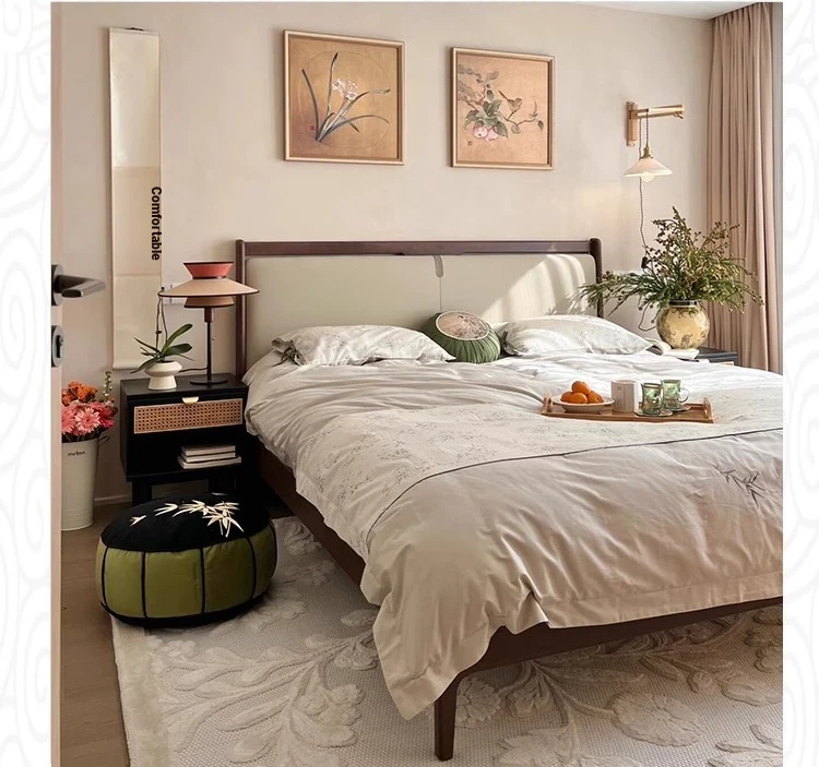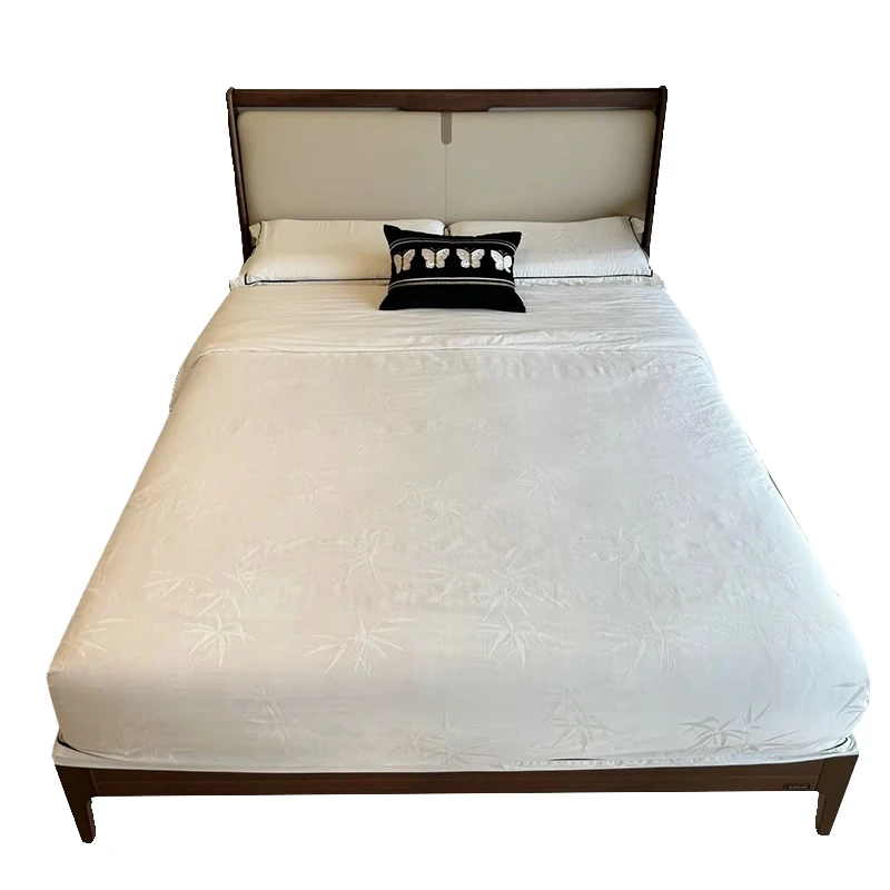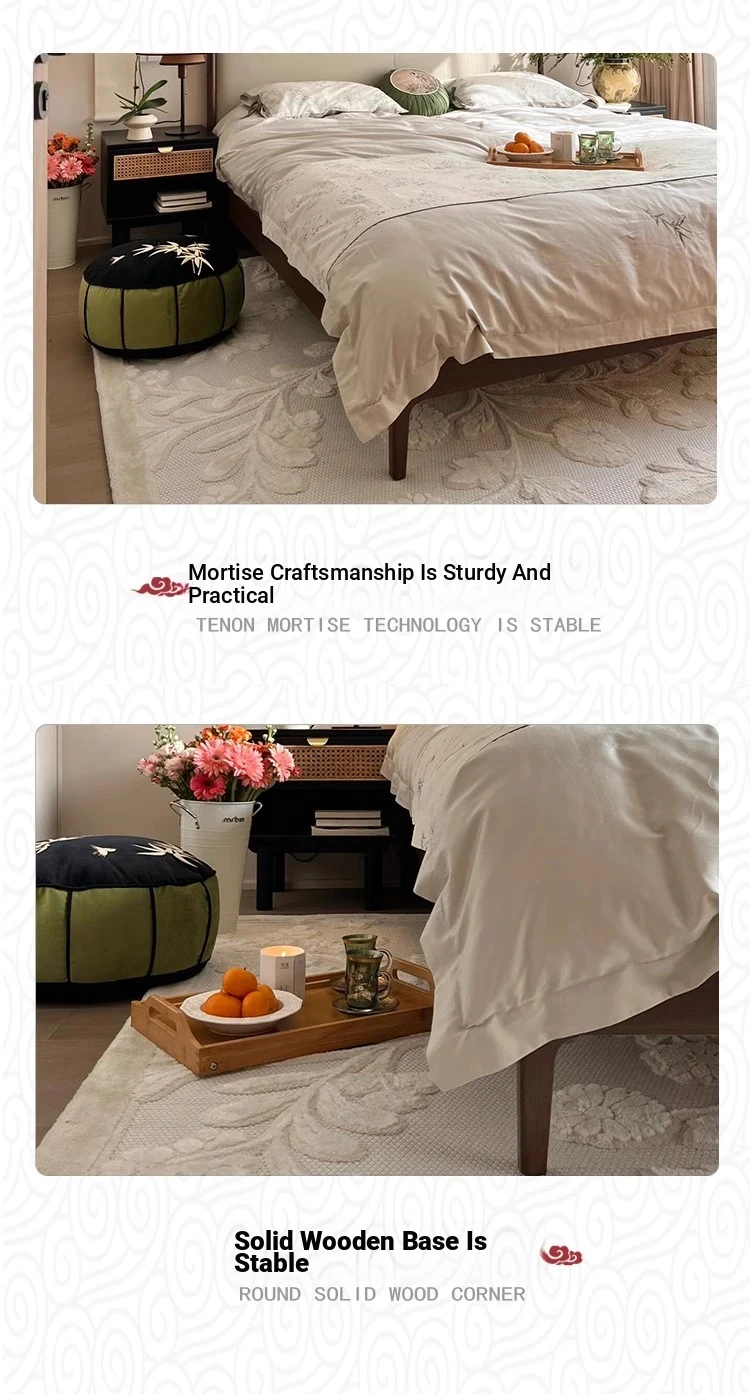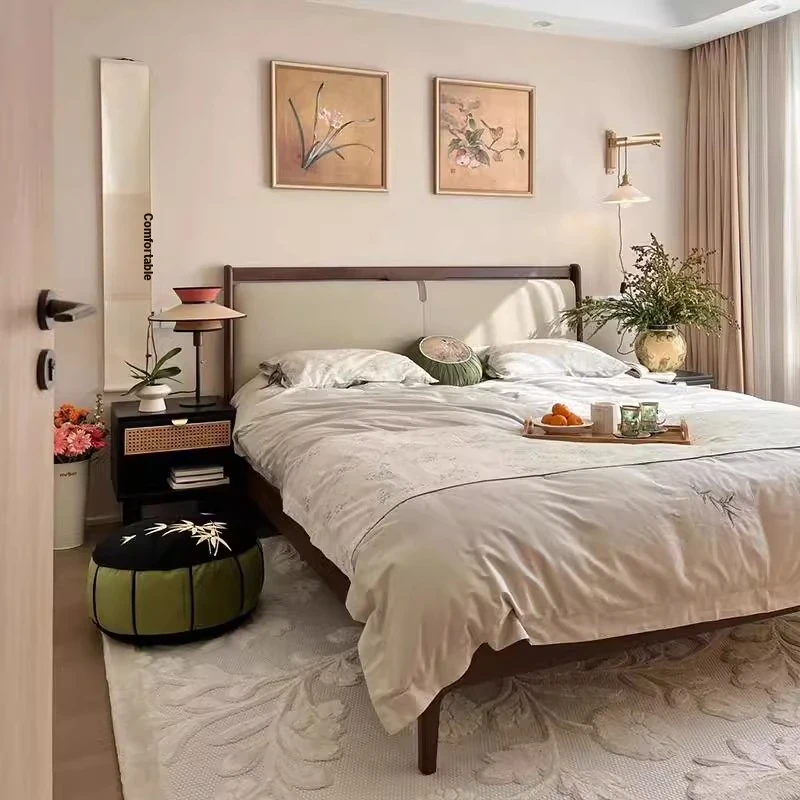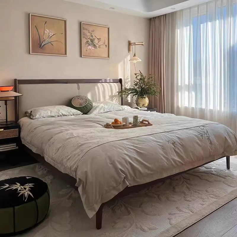Elegant New Chinese Style Solid Wood Bed - French Vintage 1.8m King Size Black Walnut - Premium Hotel and Airbnb Furniture with Classic Aesthetic
